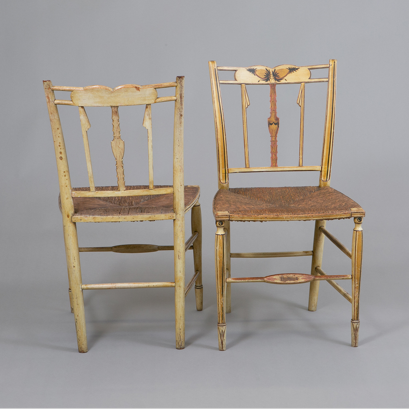 This rare pair of “Fancy Chairs” have survived in a remarkable state of preservation. Having shaped crests above carved vertical splats, the central backsplat with an urn form motif, flanked by arched stiles above woven rush seats. The molded-edge seat frames are supported with tapered turned legs with side stretchers, the central with a flat face. The chairs are decorated with paint and gilt influenced by the neo-classical style. A similar example is illustrated in American Painted Furniture 1660-1880, by Dean FAles, Jr. and Robert Bishop, p. 146, plate 238.