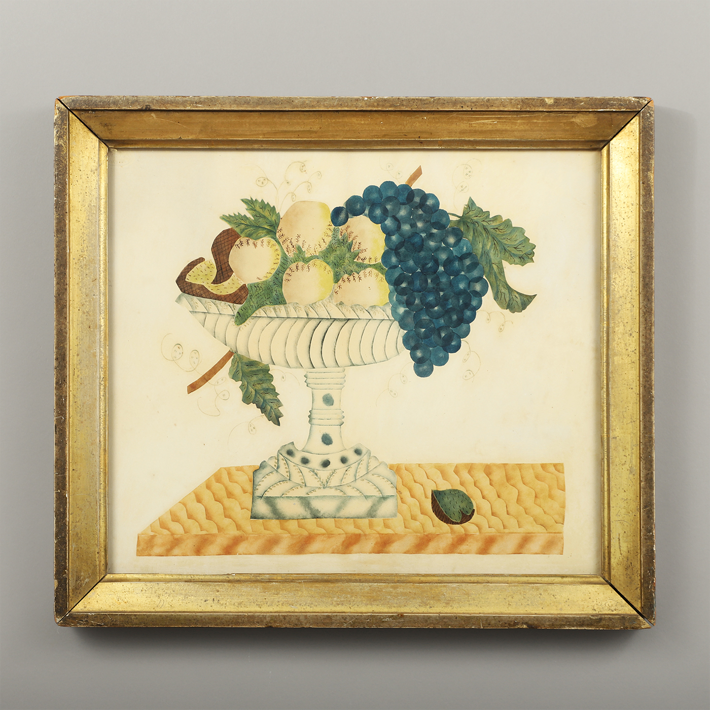 The composition of this still life, Fruit and Nut, is a wonderful example of American folk art. The artist’s use of negative space evokes a contemporary feel while also exhibiting traditional styles of 19th century American theorems.
