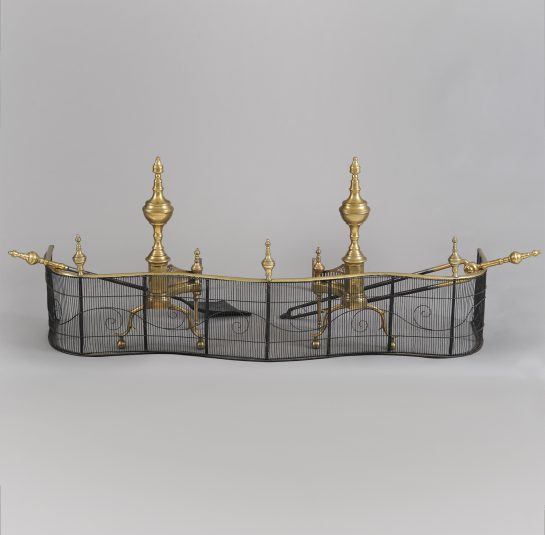 The left and right steeple-top andirons with turned shafts, fender guards and spurred cabriole legs ending on ball feet with matching tools, is complimented with a rare serpentine-front wire-work fender with turned steeple-top finials.