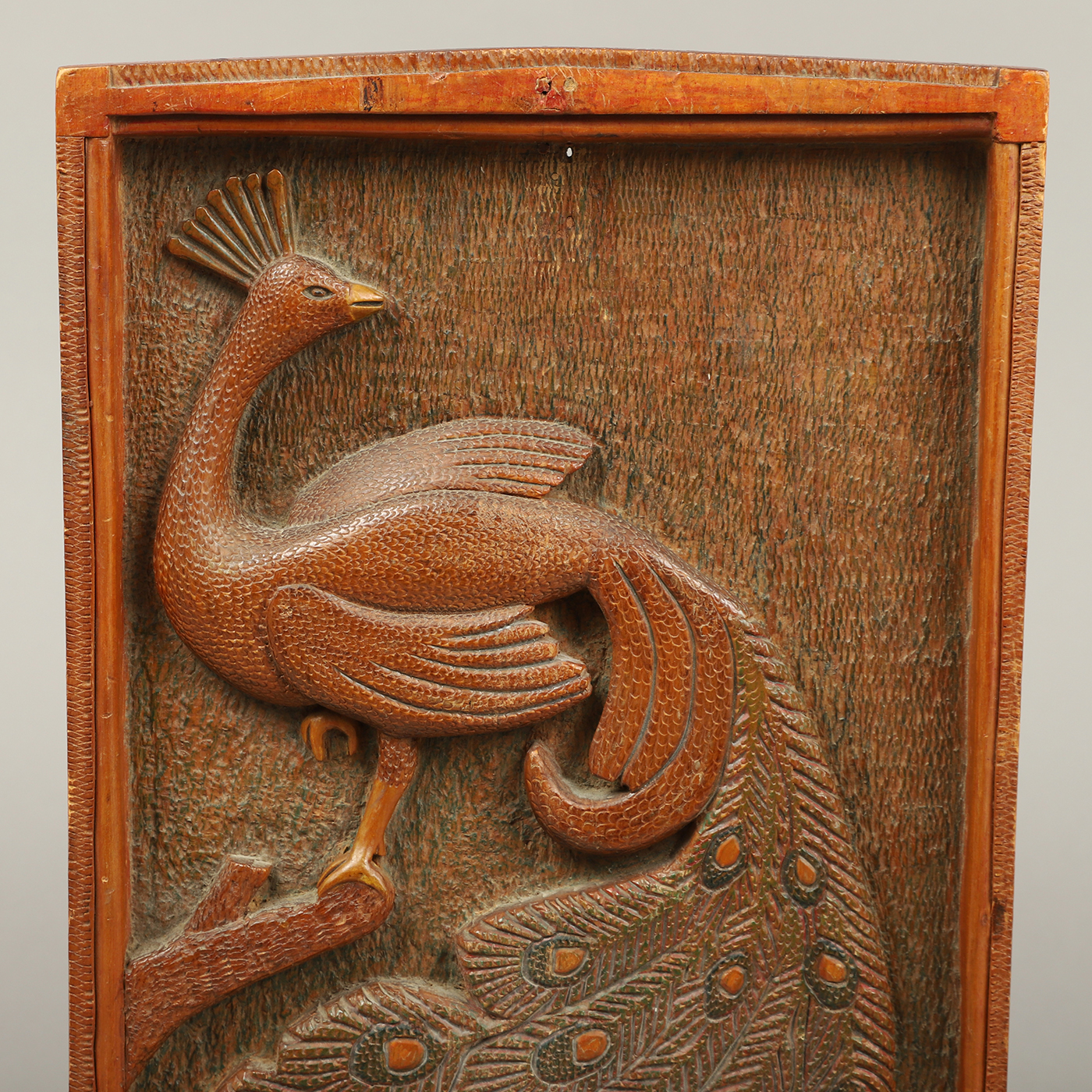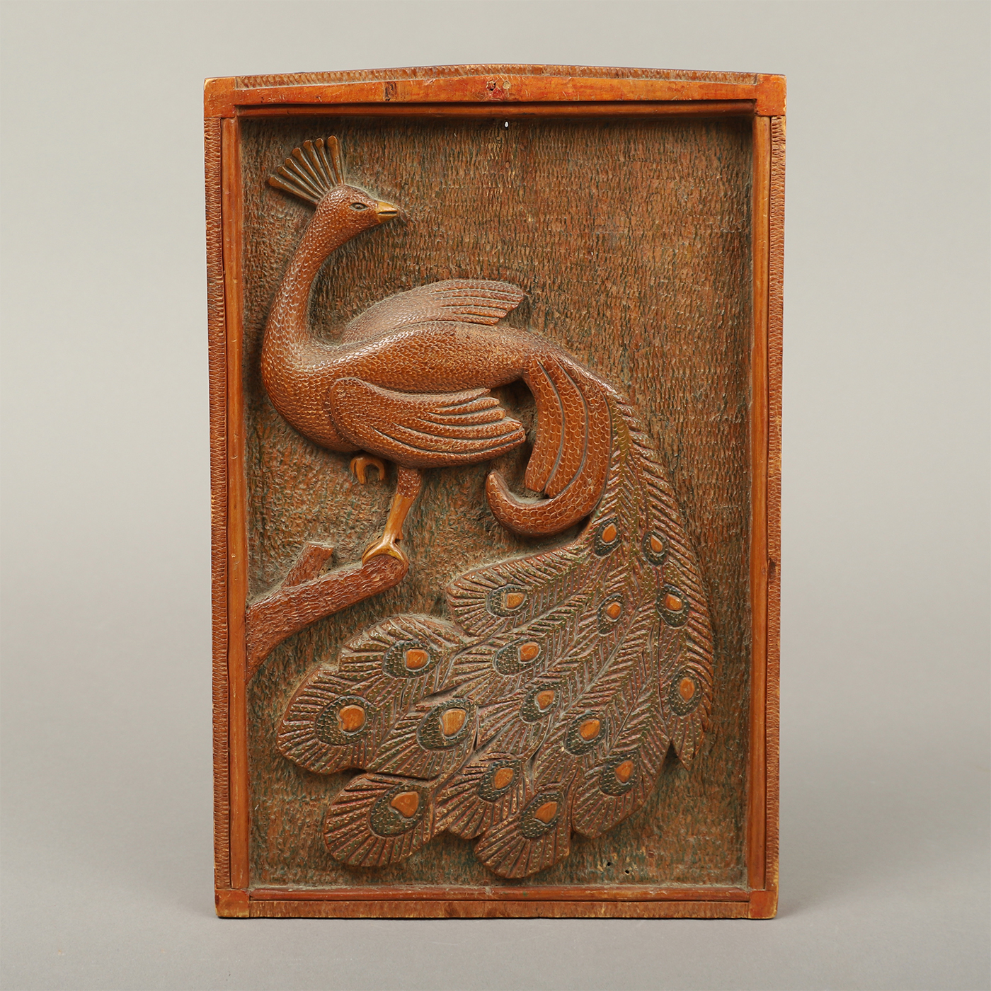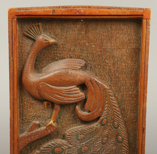 This wonderfully whimsical chip-carved folk art plaque depicting a roosting peacock has an aesthetically pleasing quality.