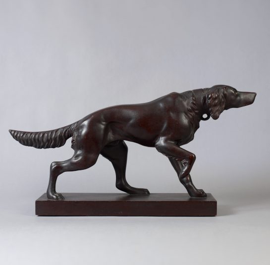 The carved figure of a setter is made of laminated pieces of wood and then skillfully carved. Coupled with the quality of the carving and posturing of the dog it retains a wonderful undisturbed varnish finish which is desirable among folk art collectors.