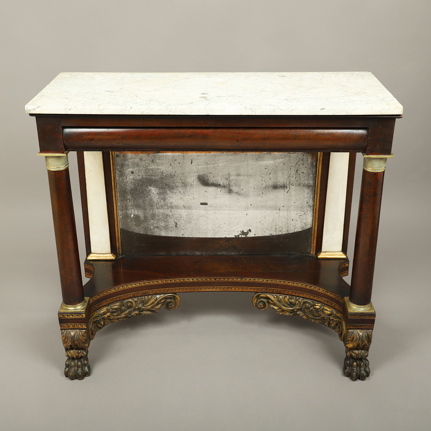 Inspired by similar classical sources, Philadelphia and New York cabinet makers both produced high-quality pier tables, often made with the most expensive woods and materials serving to show off opulence and stylish taste, however, both had regional distinctions. This pier table has more New York cabinet making attributes, such as molded rails, marble pilaster columns, brass caps and the ornately carved gilt and painted lions paw feet with incurved lower shelf.
