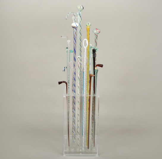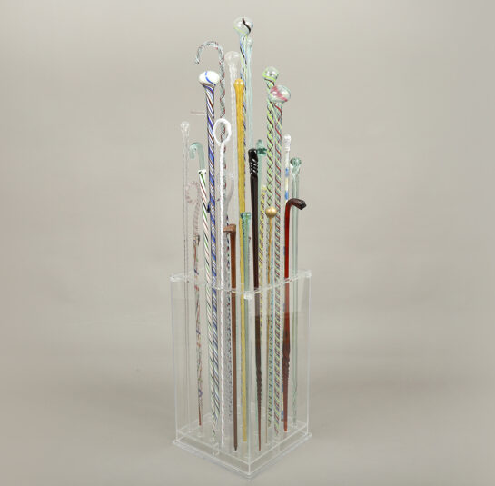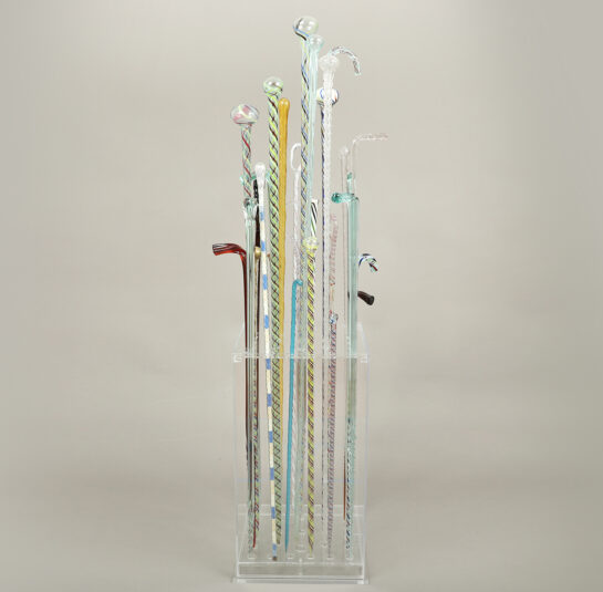 Having taken some time to assemble this group of 28 blown glass canes, the previous collector smartly designed a transparent acrylic display base showcasing the different forms, colors, and designs. These canes represent examples made by glass-blowers at the end of the day with leftover molten glass from the furnace. They were considered whimseys, yet were used to show off one’s expertise and skill among colleagues and family.