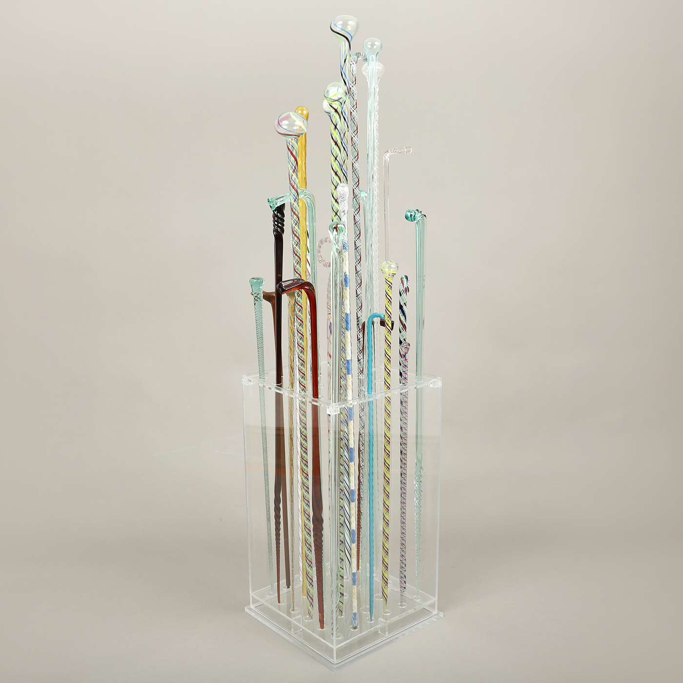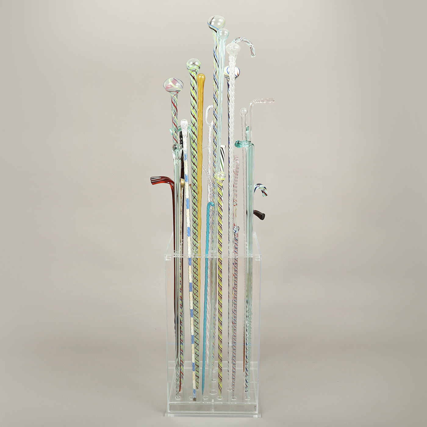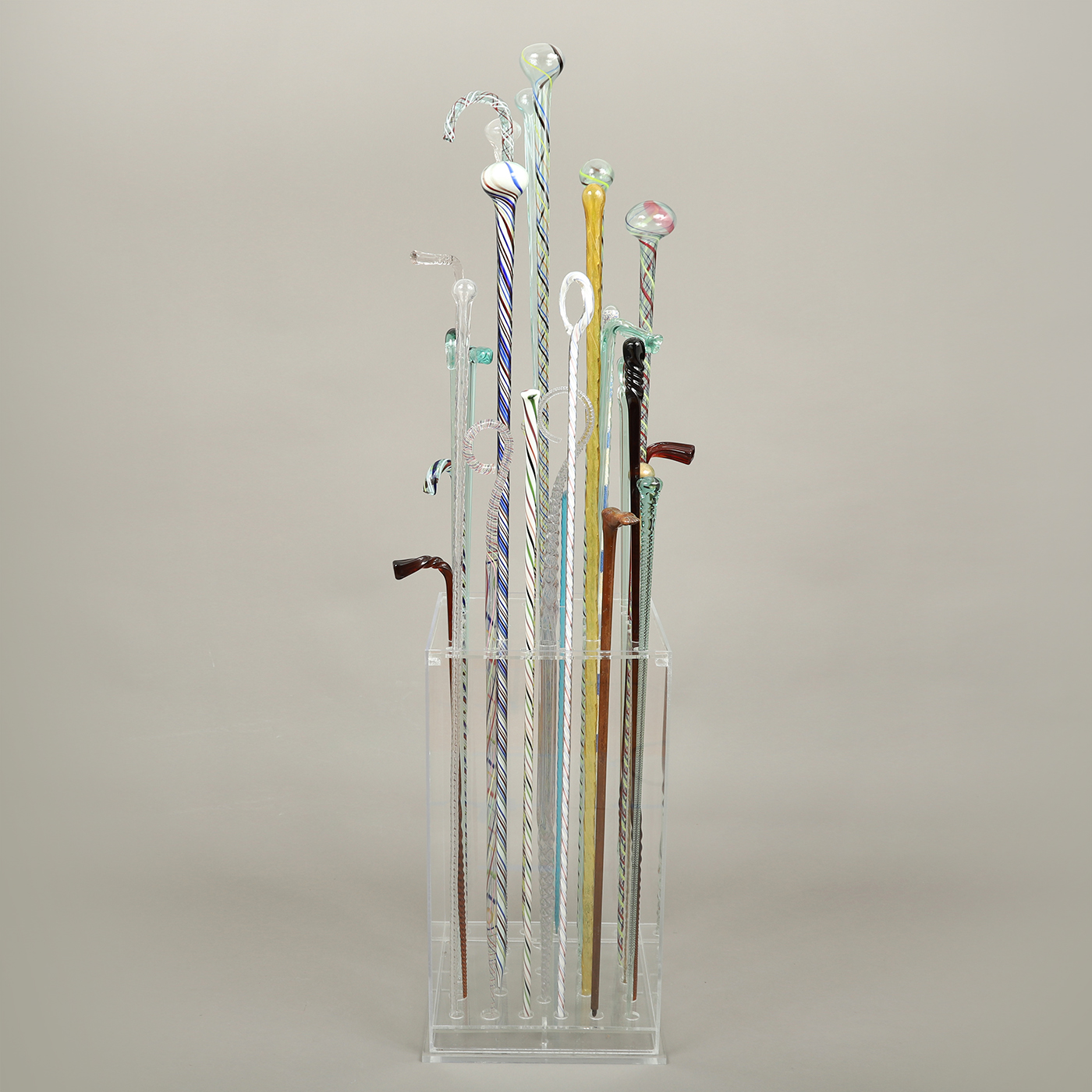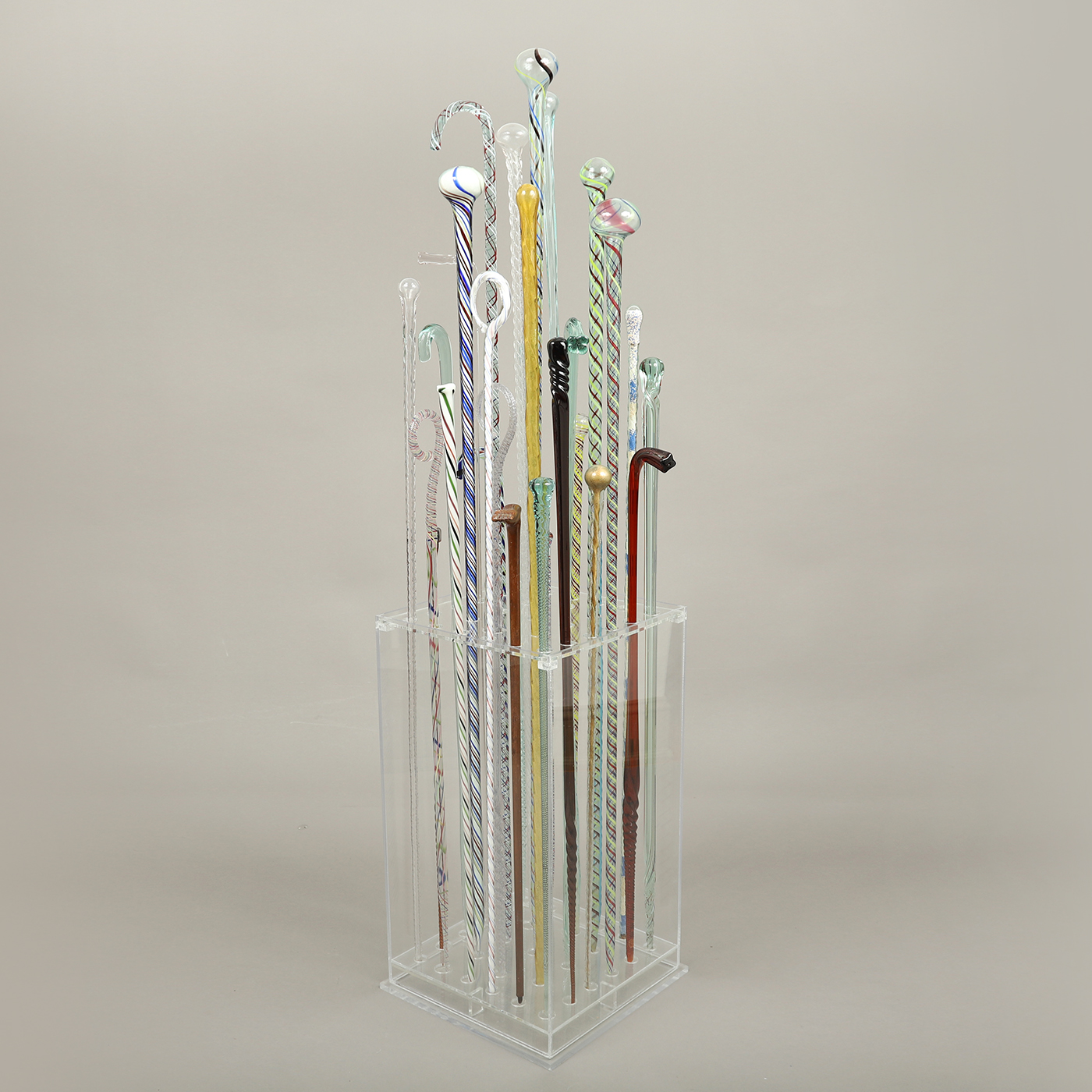 Having taken some time to assemble this group of 28 blown glass canes, the previous collector smartly designed a transparent acrylic display base showcasing the different forms, colors, and designs. These canes represent examples made by glass-blowers at the end of the day with leftover molten glass from the furnace. They were considered whimseys, yet were used to show off one’s expertise and skill among colleagues and family.