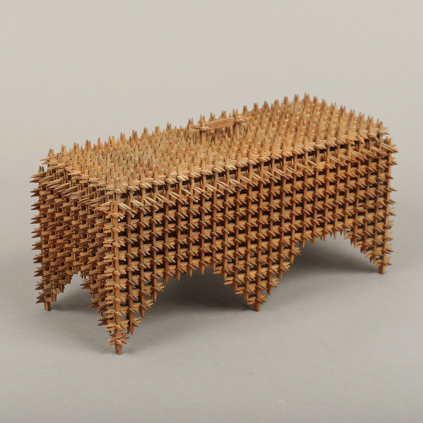 A woodworking technique of tramp art, this finely executed crown of thorns box with a fitted lid and a carved handle displays wonderful triangular geometric designs transcending into a piece of sculpture.