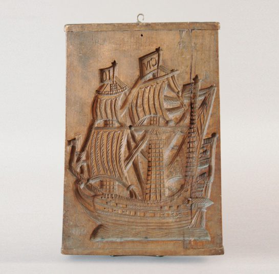 Carved walnut depicting a mounted officer with his sword drawn on one side and a three-masted ship on the other side.