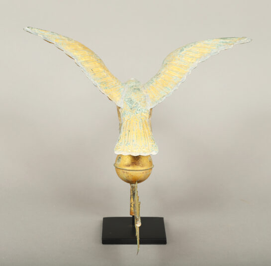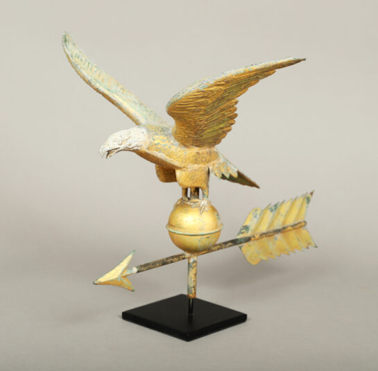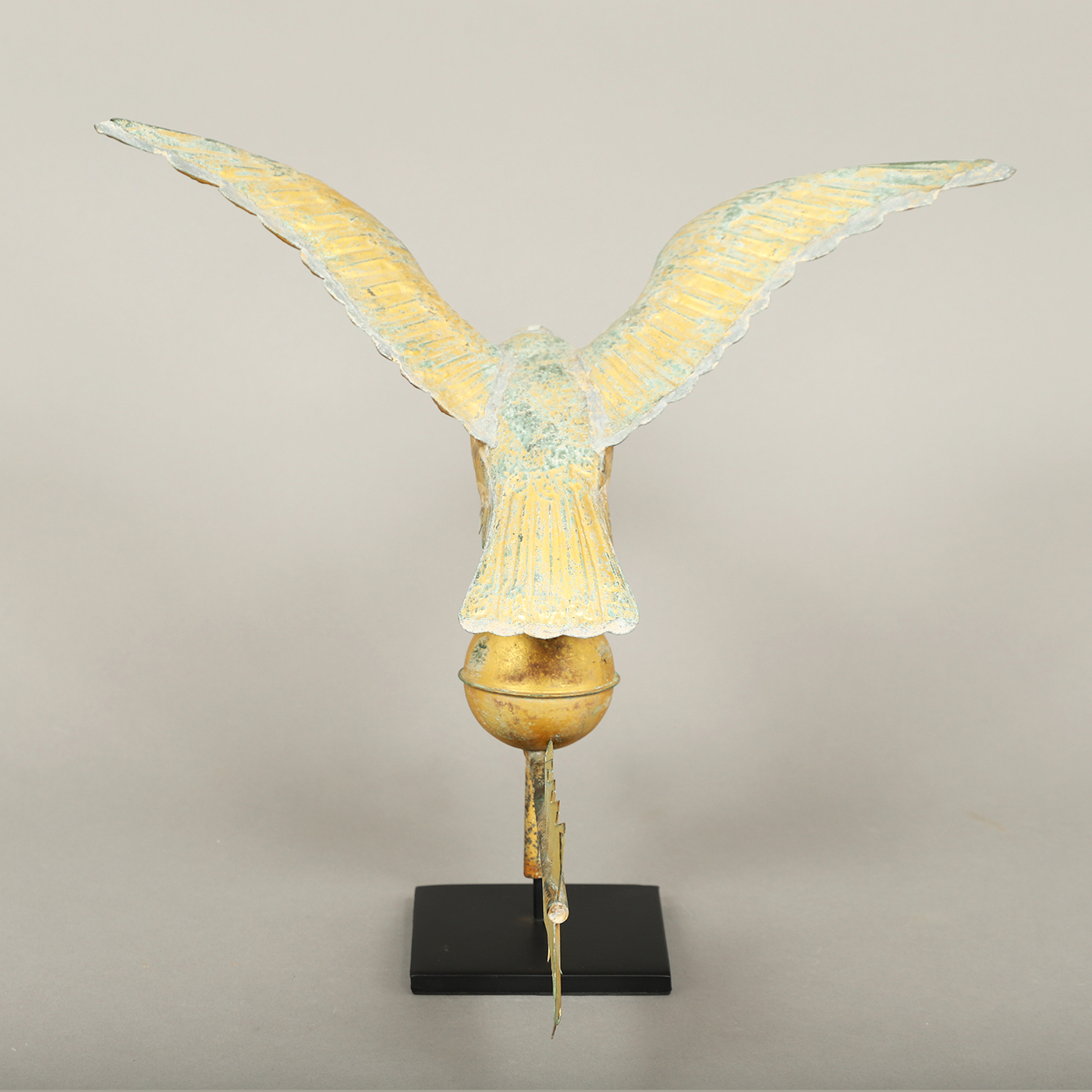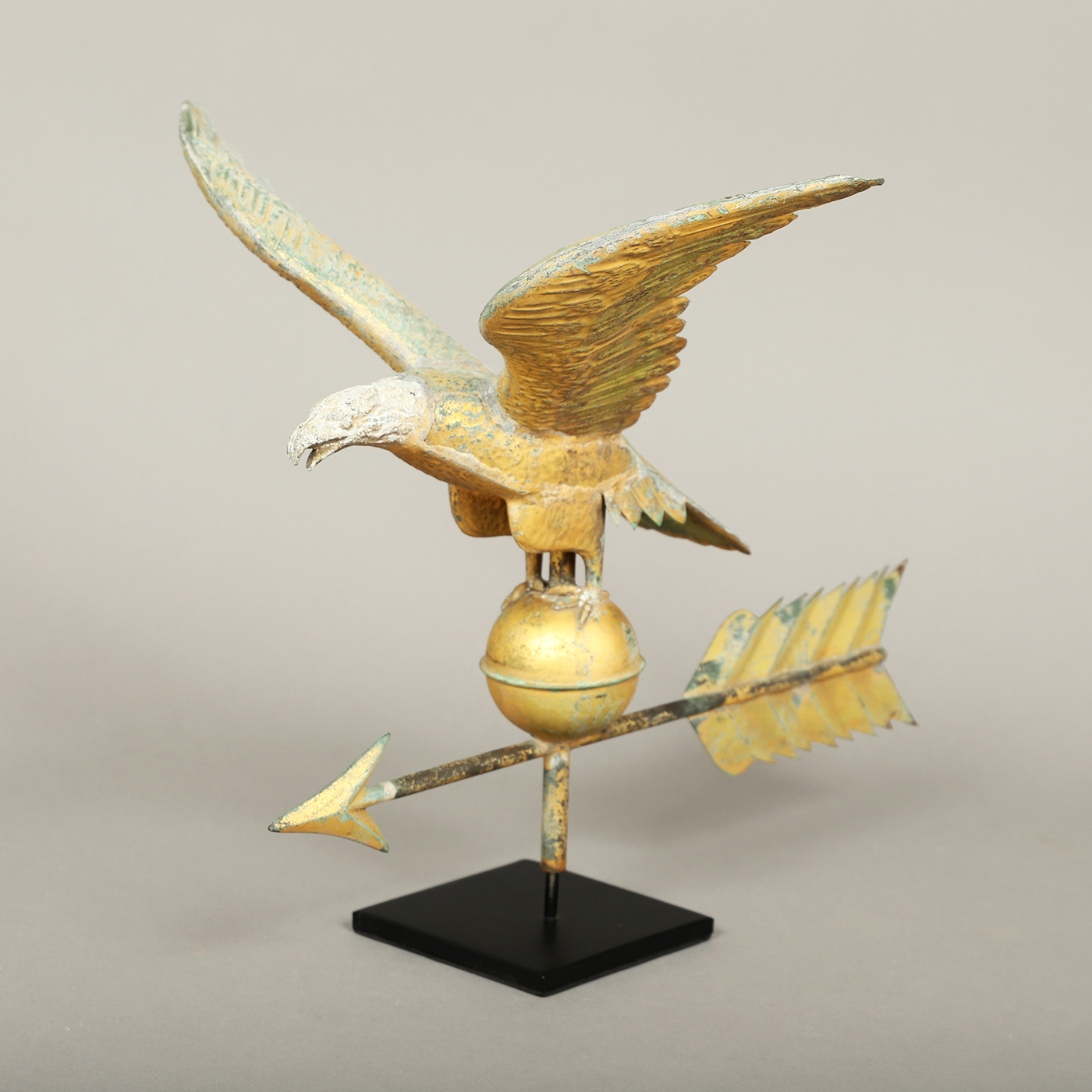 This finely detailed eagle body mounted atop a sphere and arrow has survived in a remarkable state of preservation. The majority of the original gilding is intact, with areas of patination from its history of outdoor exposure.