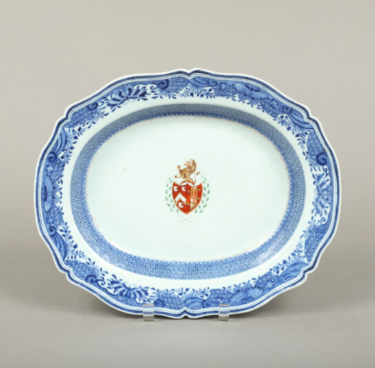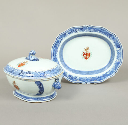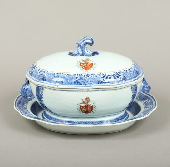 This Chinese Export soup tureen with covered lid and original under-plate is decorated with blue Fitzhugh-type boarders and bears the arms of the Arthur family of Clopton and Springfield in Essex, England, impaling those of the Darvall or D’Arville family of England, who were granted arms in 1755.