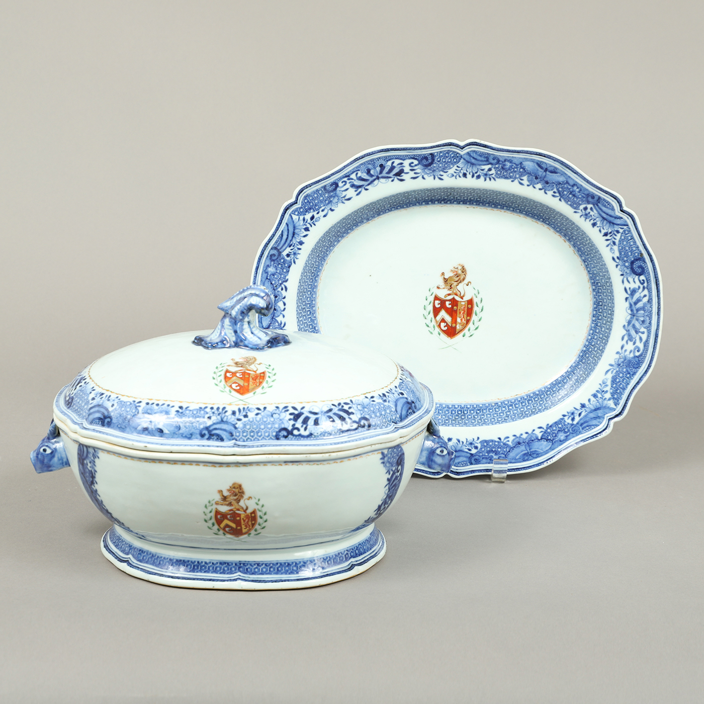 This Chinese Export soup tureen with covered lid and original under-plate is decorated with blue Fitzhugh-type boarders and bears the arms of the Arthur family of Clopton and Springfield in Essex, England, impaling those of the Darvall or D’Arville family of England, who were granted arms in 1755.