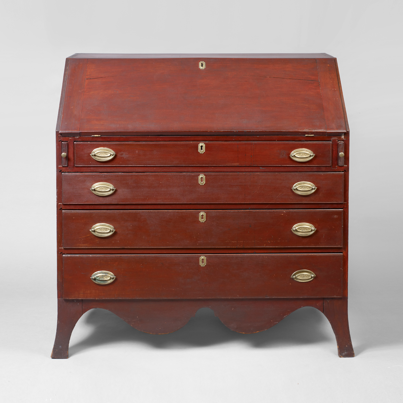 The tall base with the lobed, shaped skirt, supported by a more refined flared French foot, are the desk’s strongest features. Coupled with the original surface and overall condition, they constitute a fine example of high country furniture.