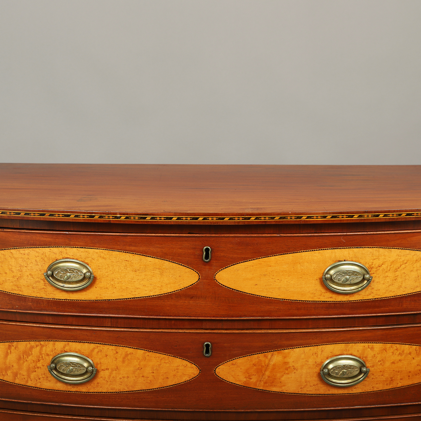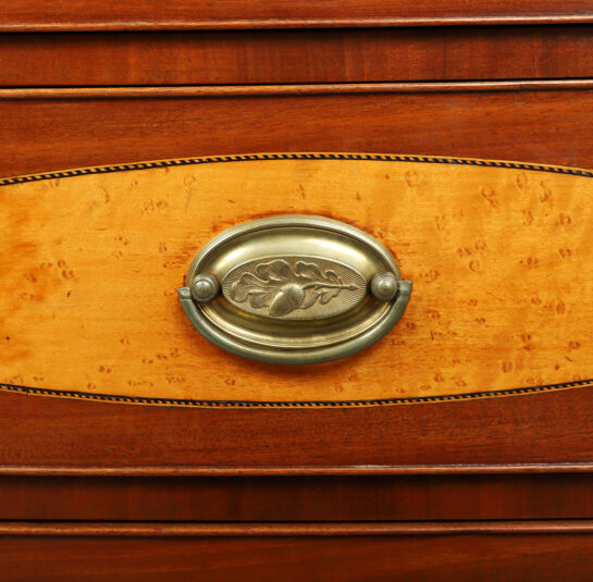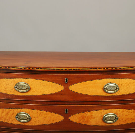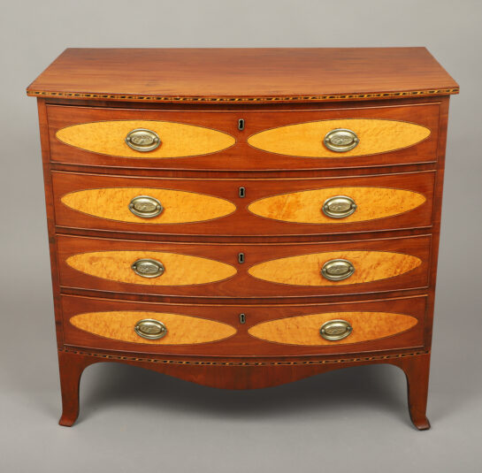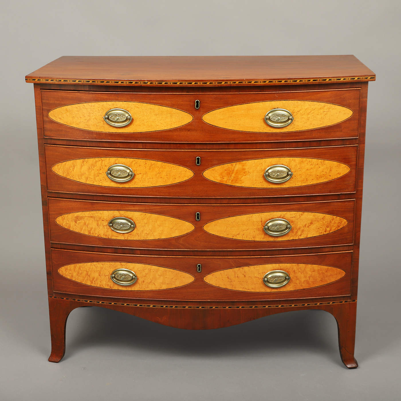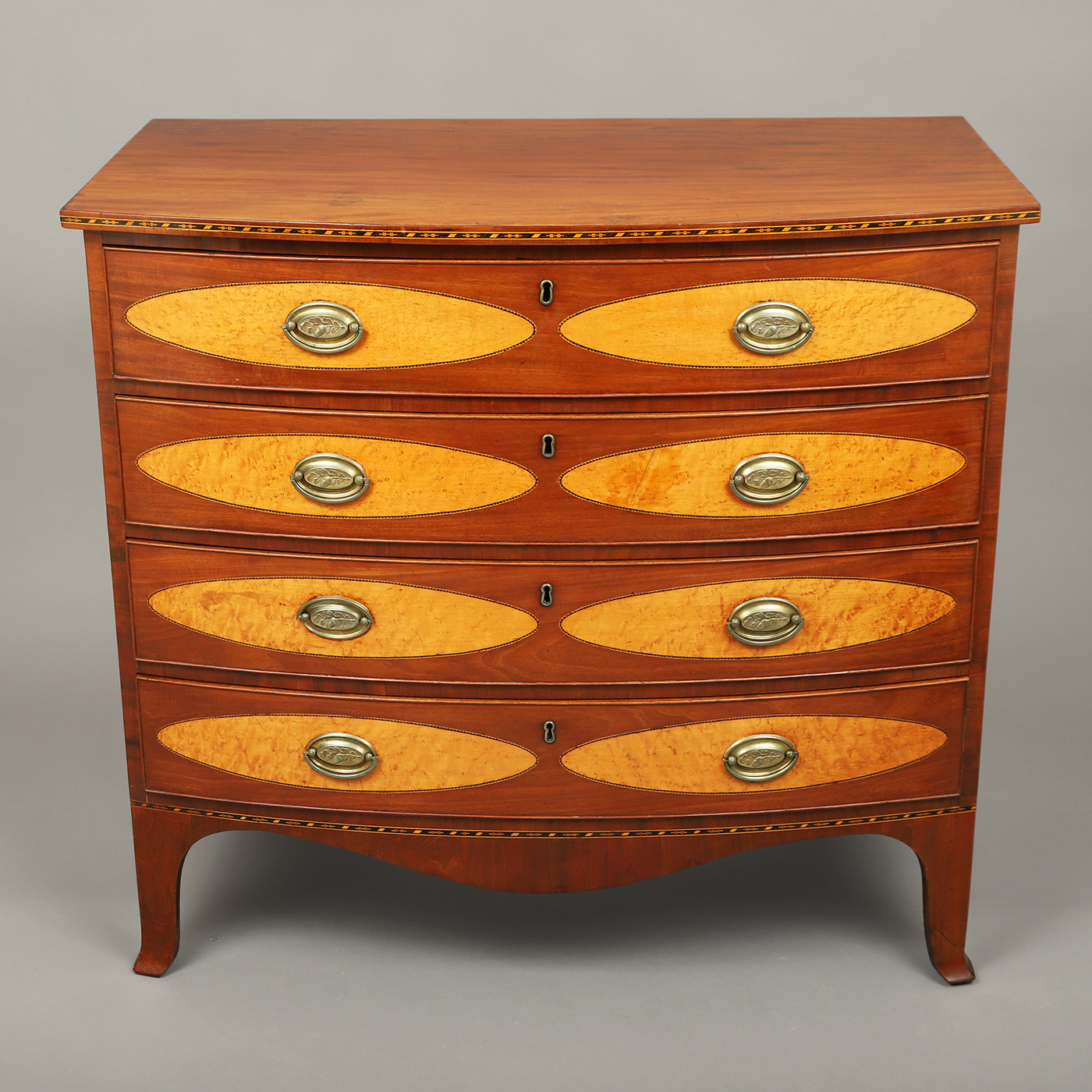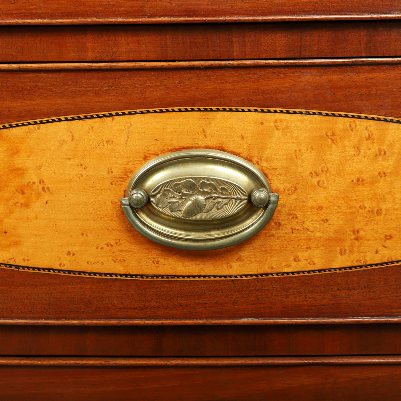 The Figured mahogany top with banded inlay edge above four cockbeaded long drawers each veneered with two barber-pole traced birdeye maple oval panels above a shaped apron with inlaid banding is supported by tall swept French feet. The use of birdseye maple oval panels makes this a rare example.