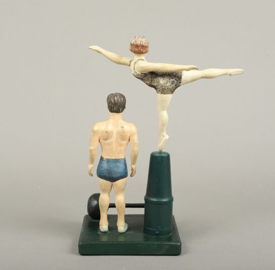 This wonderfully whimsical folk-art carving of two figures, appearing as a weight lifter and gymnast, has great appeal. The creator captured a sense of style for this period, along with a little humor and wit. The gymnast rotates on her pedestal.