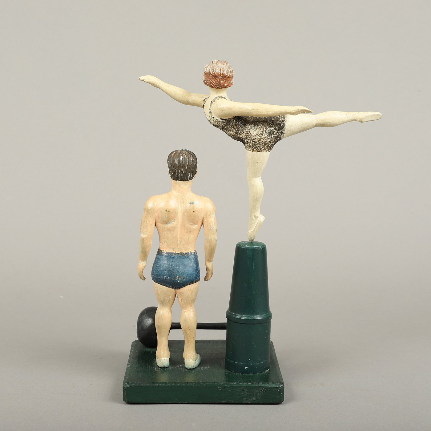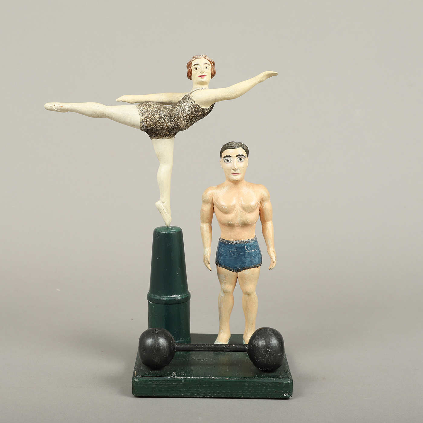 This wonderfully whimsical folk-art carving of two figures, appearing as a weight lifter and gymnast, has great appeal. The creator captured a sense of style for this period, along with a little humor and wit. The gymnast rotates on her pedestal.