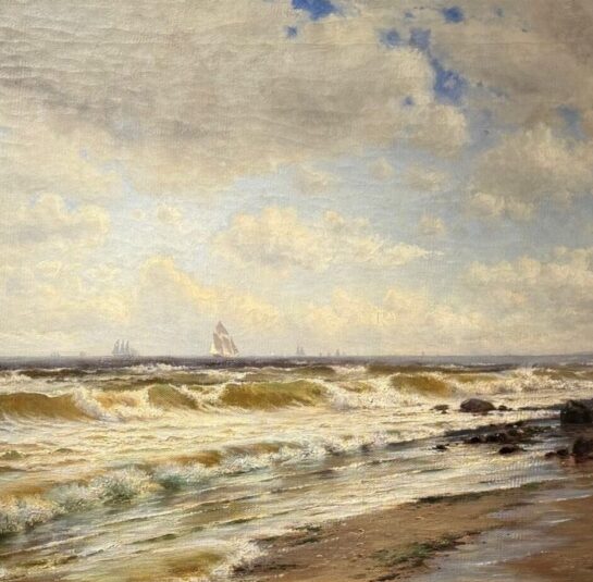 Francis A. Silva was best known for his coastal views and marine paintings, becoming one of the leading members of the luminist style in the mid-to-late 19th century. Evolving from a self-taught artist, he had a remarkably skillful technique, most notably with atmospheric effects that varied little throughout his career. This wonderful view of The Beach Near Port Judith, Rhode Island certainly captures his talent, which received much acclaim among his contemporaries and patrons of the period. Today he is well represented in major museums and private collections.