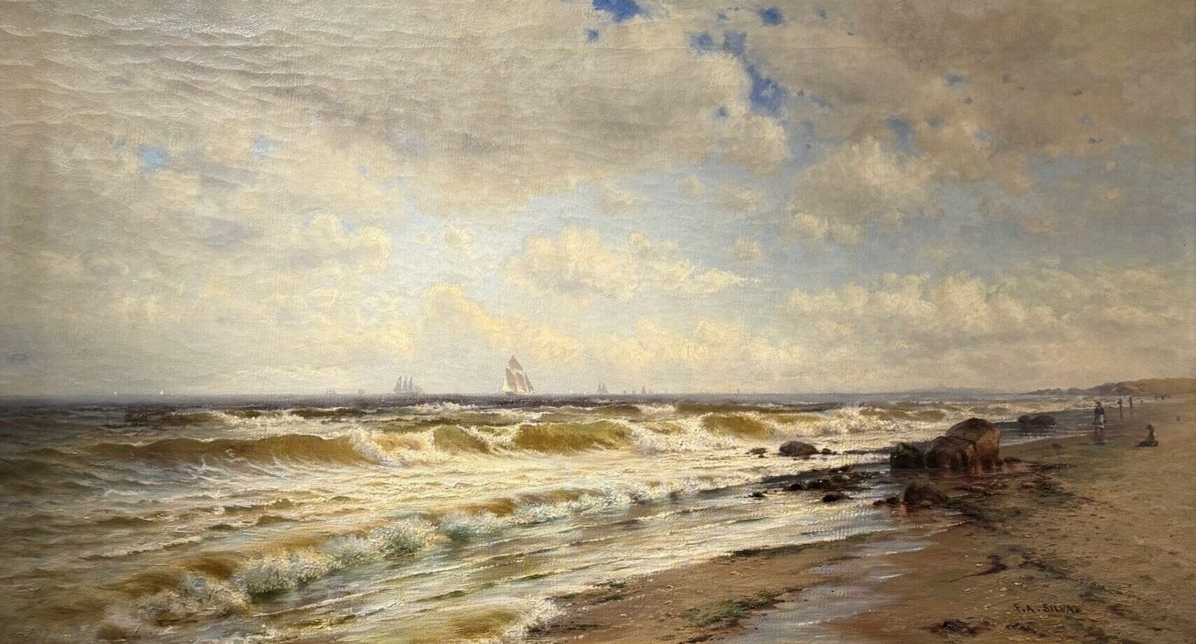 Francis A. Silva was best known for his coastal views and marine paintings, becoming one of the leading members of the luminist style in the mid-to-late 19th century. Evolving from a self-taught artist, he had a remarkably skillful technique, most notably with atmospheric effects that varied little throughout his career. This wonderful view of The Beach Near Port Judith, Rhode Island certainly captures his talent, which received much acclaim among his contemporaries and patrons of the period. Today he is well represented in major museums and private collections.