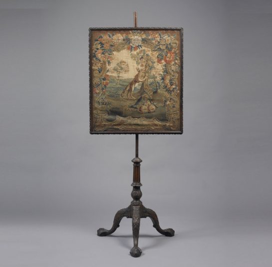 Fine condition, virtually no restoration to the base, tapestry is worn through in places, patch in the center (“canty”) of a later date, top finial replaced, carved frame appears to be original, dry old surface. The base is extremely well carved and executed, exhibiting a turned shaft with fluting and acanthus leaf carving above c-scrolled cabriole legs with foliage carving ending on carved ball and claw feet.