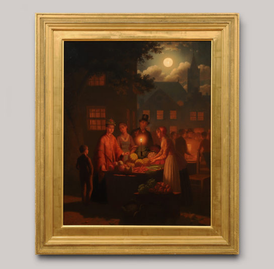 Known for his landscapes and “candlelight” genre scenes, Culverhouse successfully captured Dutch life of the 17th c. as seen here in the market place scene. Culverhouse exhibited at all the prestigious venues in both Europe and America during the mid-19th c. By 1865, Culverhouse established himself in the American art market while living in New York. His works today are represented in many museums and private collections.