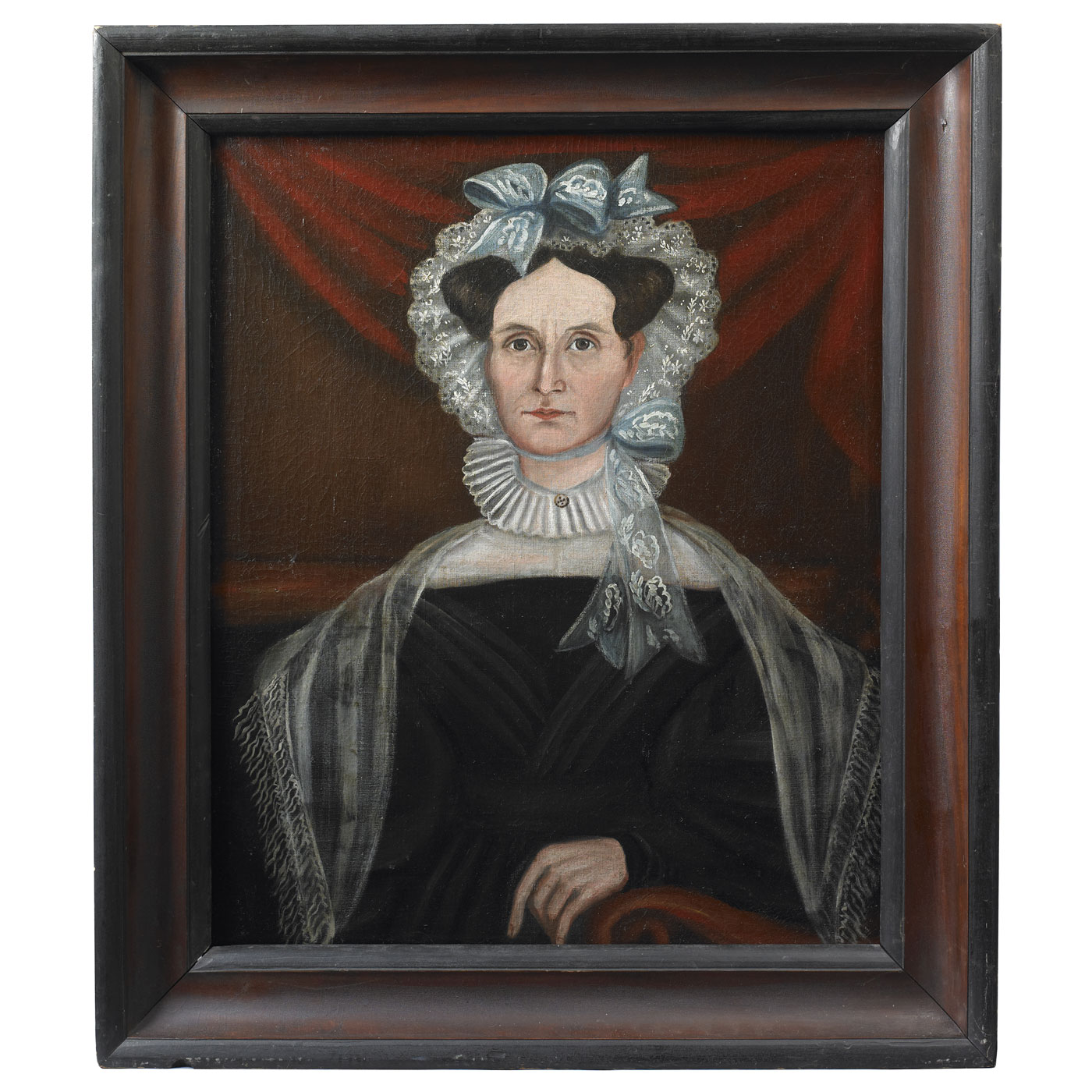 Affixed to the back of the frame are remnants of labels pertaining to the family history of this portrait. Along with written notes and research provided by Mrs. Herbert Ashley Durfee, Jr. who was researching for the Smithsonian’s inventory of American portrait painting, she has concluded that the portrait of Lucy Marshall was painted by the combined hands of Grout and Shute both of which painted other portraits of the family during this time. The sitter of this portrait, Lucy Marshall, is the daughter of Mrs. Lecter Buck who married Paul Marshall after the death of her husband, Isaac Buck. The label on the verso of the frame identifies his name. Lucy Marshall married Albert Griffen. Other portraits of the Marshall-Griffen family were also painted by Ruth Whittier Shute and John H. Grout and it is believed by the family that this portrait was painted as a part of the group. This portrait has descended through the family to the present day.
