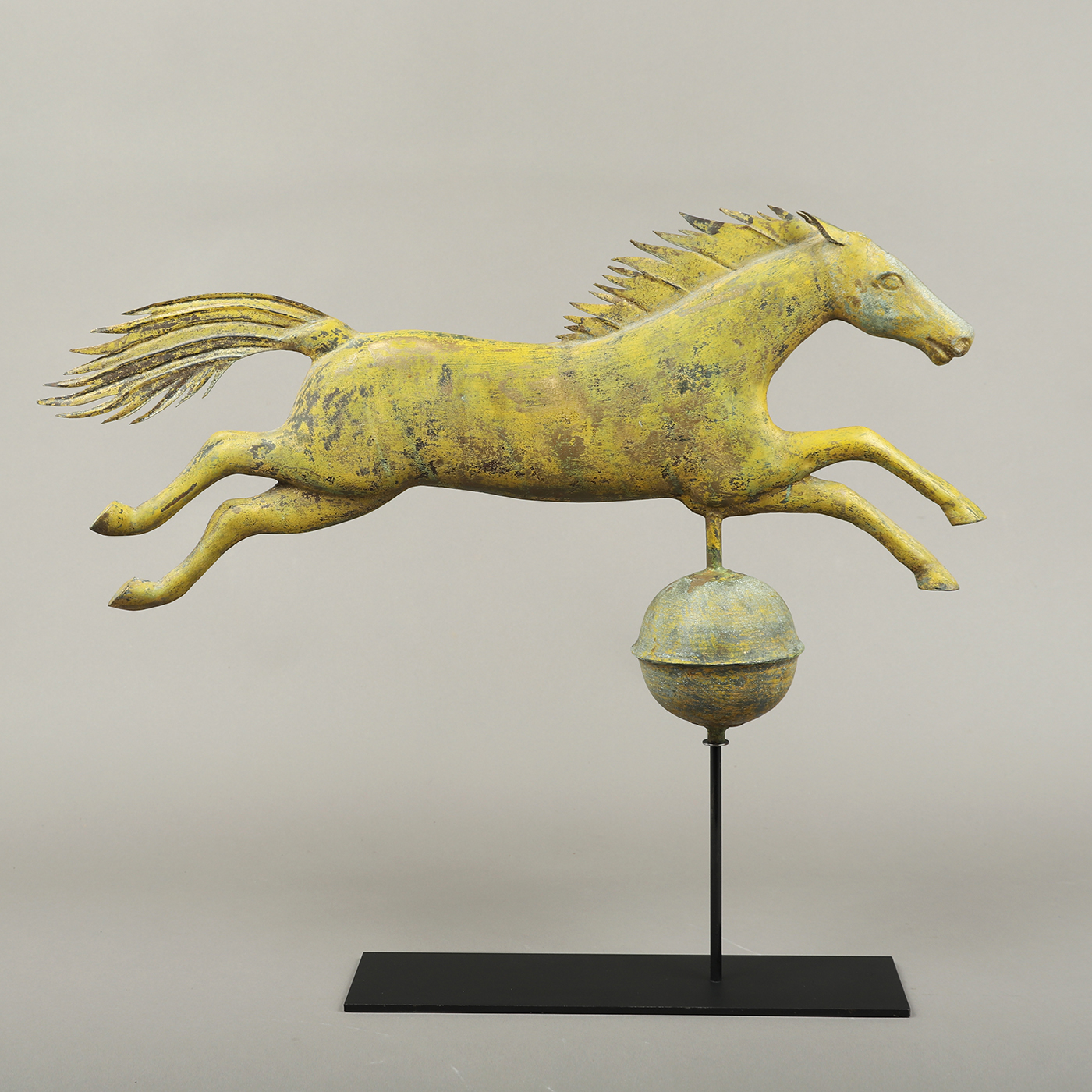 Capturing a wonderful sense of motion, this Jumping Horse over a Sphere Weathervane has survived in a remarkable state of preservation, retaining an exceptional dry oxidized surface, highlighted with shades of yellow from the original sizing, further enhancing its’ aesthetic appeal. This example is among only a few known signed surviving examples.