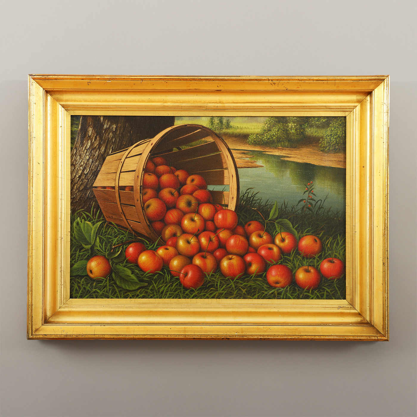 Although self-taught, Levi Wells Prentice’s paintings demonstrate a remarkable skill at rendering color, form and texture. Best known for his realistic still-life compositions of fruit arranged within a landscape, or abundantly spilling from bushel baskets as seen here. Prentice’s fruit still-lifes are compositions intended to create dramatic contrasts. The shift between dark background areas and the vibrant hues of the fruit are done to give the compositions an exciting, visual energy.