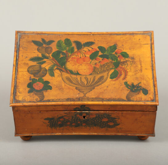 This rare box was most likely decorated by a female academy artist. The top depicts a wonderful compote of fruit flanked by flower-filled cornucopias with similar fruit arrangements decorated on the front and sides. The lid opens to a fitted interior having a removeable tray with its original dividers and a mirror. The interior tray is decorated with black floral and foliate designs.