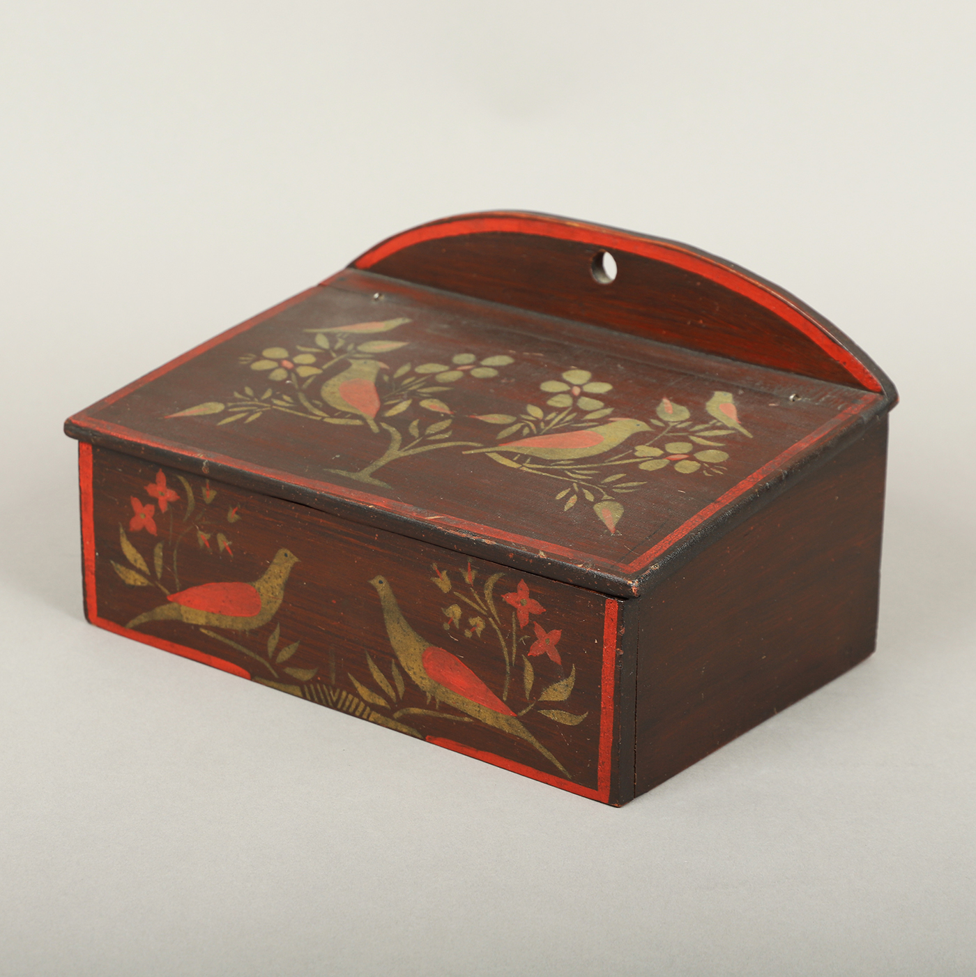 The hanging box is fitted with a lid opening to compartments. This anonymous artist had an exceptional talent for both stenciling and paint decoration, depicting mirror images of birds. The untouched condition further adds to its rarity and desirability among collectors.
