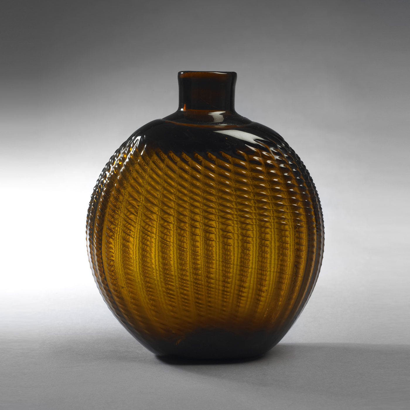 Glass, blown molded rich golden amber color with a 36 ribbed and swirled pattern, sheared mouth, tubular pontil scar.