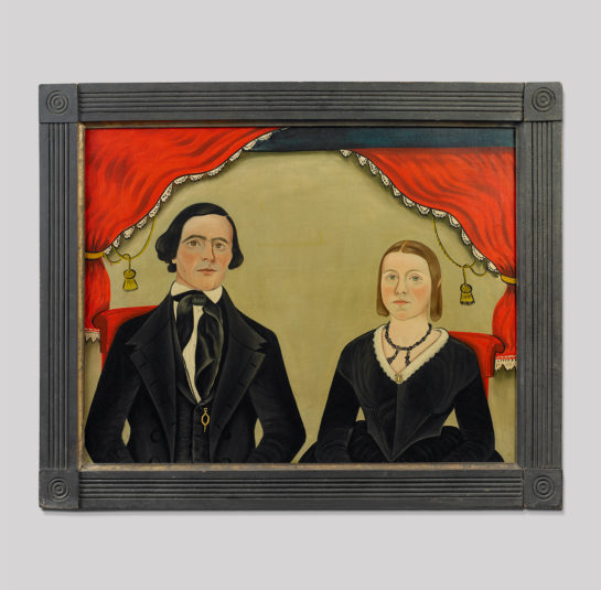 This rare and unusual double portrait of a young husband and wife depicts the woman wearing a black dress with a white lace collar and wearing a beaded jet-necklace, the gentleman in a black jacket, vest and cravat with a white shirt and gold watch fob, seated on red upholstered chairs with red drapery edged with white lace and gold tassels.