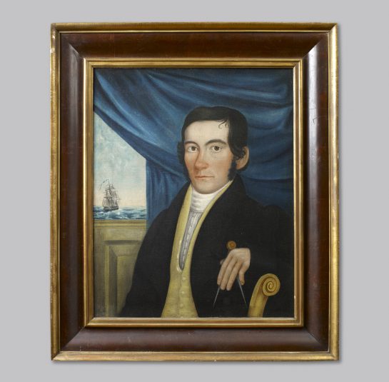 This charming portrait of a Sea Captain is painted in a wonderful folky manner. The artist incorporates a vignette most likely depicting the Captain’s ship through the window. The composition of the flowing drapery