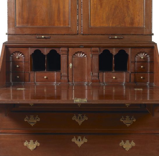 The inset mahogany panels in the doors are replacements. After removing the panels there was evidence that the doors originally had mirrored glass plates. The center finial is replaced but the side finials are original. We assume that the center plinth was adorned by a portrait bust or cartouche. The left and right bottom portions of the back ogee bracket feet have been restored. It appears that there was a writing surface tacked to the inside lid of the desk. All other elements of the secretary are original, to include; the brass hardware, plates (four escutcheons signed; “T. Gold), lid hinges and door hinges.