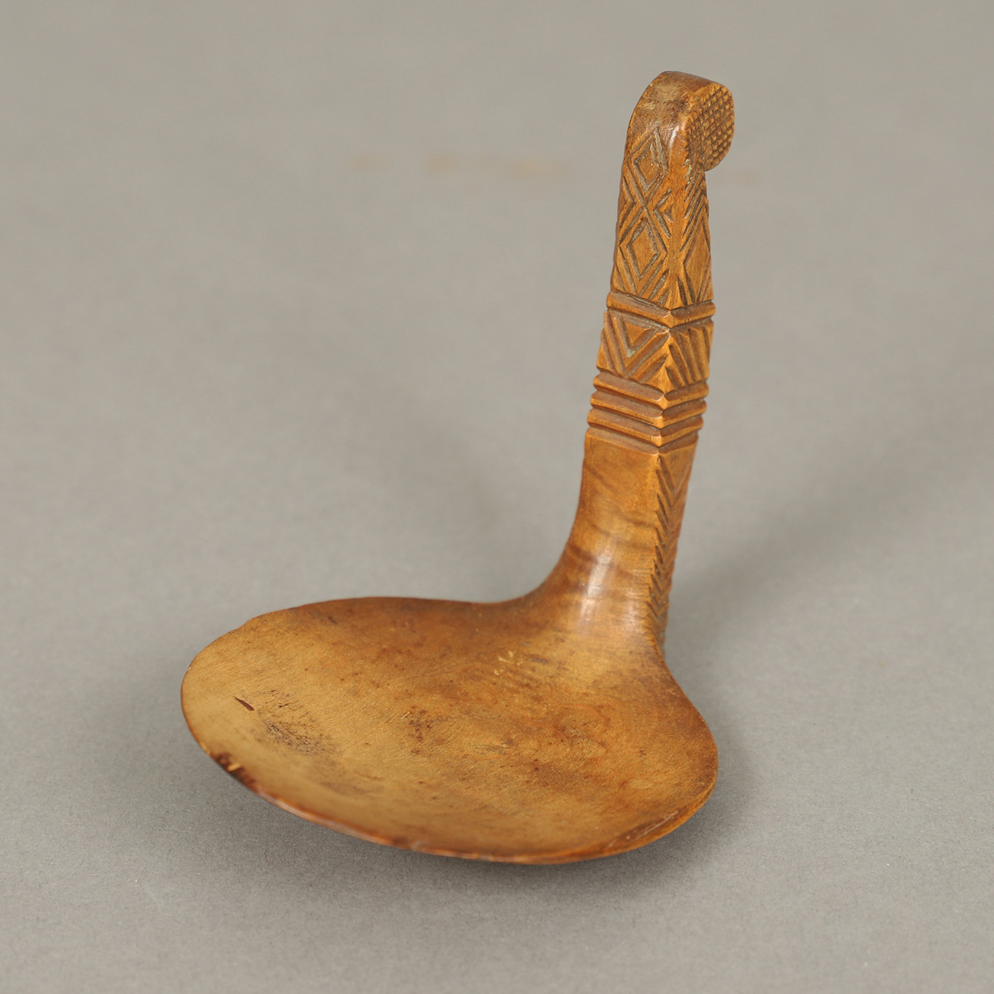Probably Native American. Northeastern, ca. 1820-1840. Carved maple. Great condition, natural wear and patina. Having a chip carved handle with geometric designs and scooped-out, shaped spoon all from a single piece of maple.