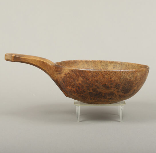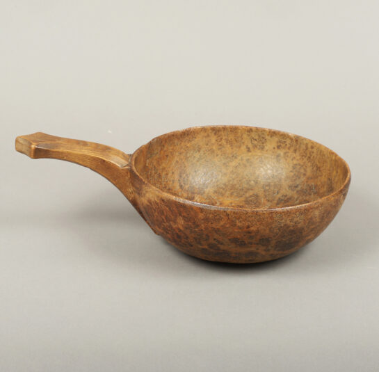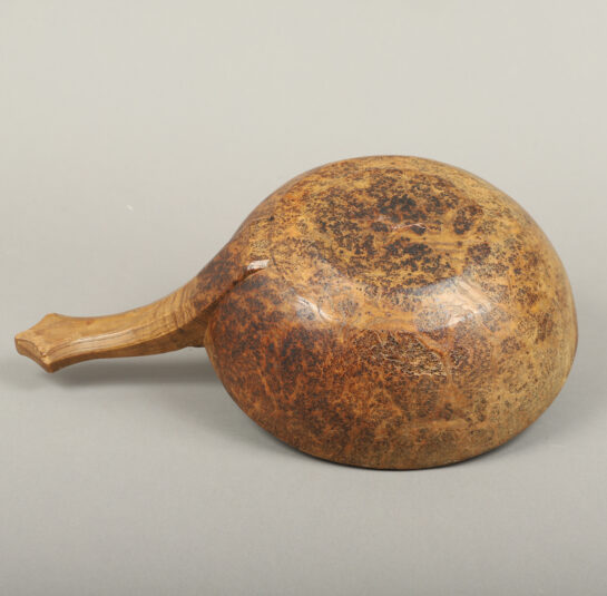 This rare handled burl bowl is related to a group of burl articles found in southern New England that are thought to be Native American in origin. The elongated shaped handle terminating in a trefoil design resembling a turtle head seems to be the common link within this group. This example is expertly conceived and executed.