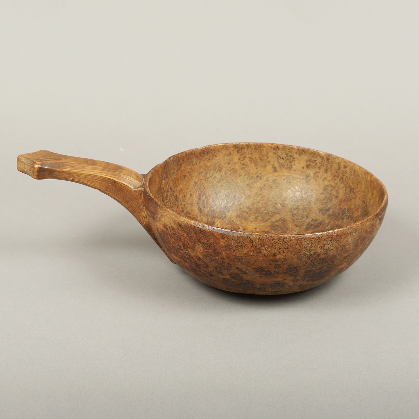 This rare handled burl bowl is related to a group of burl articles found in southern New England that are thought to be Native American in origin. The elongated shaped handle terminating in a trefoil design resembling a turtle head seems to be the common link within this group. This example is expertly conceived and executed.