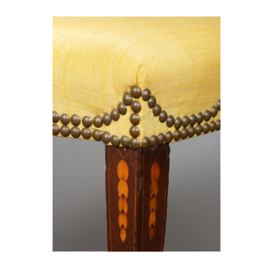 The design and execution of this chair are of the finest quality and exhibit the distinct features found on New York chairs. The crisp detailed carving of the drapery swags and central plum on the splat is framed in a shield-back. The delicate flared out tapered legs are embellished with overlapping husk inlay patterns and highlighted with fine line inlay terminating into the cuffs. The style of inlay is also characteristic of pieces found in New York.