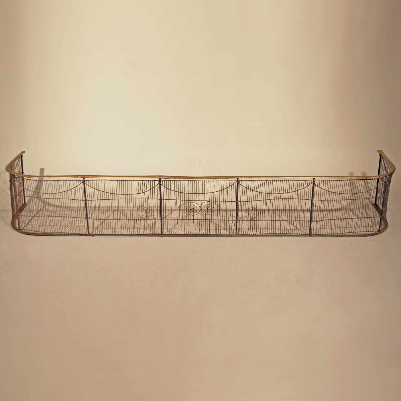 A fairly standard design having a brass rail above wire-work with drapery swag and scroll motifs but in a large, hard-to-find size.