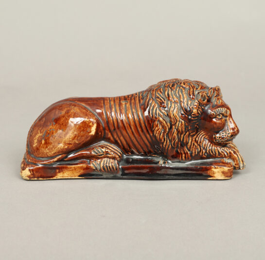 As classic example of a recumbent lion having a well-defined body and full mane with a docile facial expression.