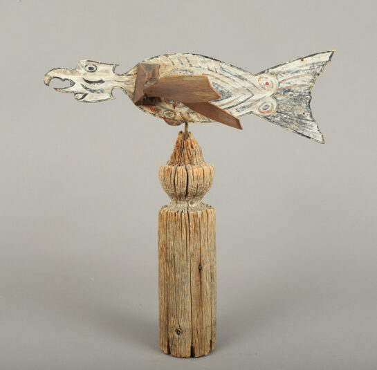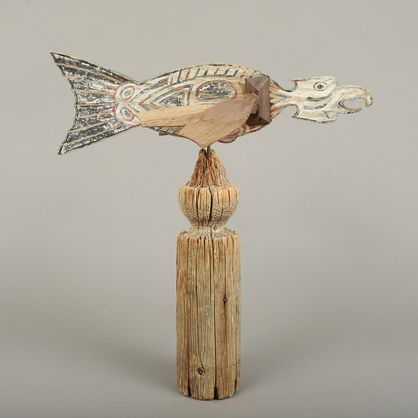 This carved silhouette of an eagle is fitted with rotating pinwheel wings and retains an outstanding untouched weathered surface. The Native Eagle symbol is known as “The master of skies” and is a symbol of great significance and is believed to be the creature with the closest relationship with the creator.